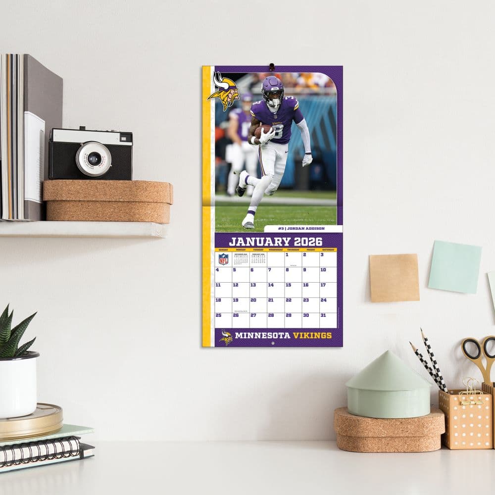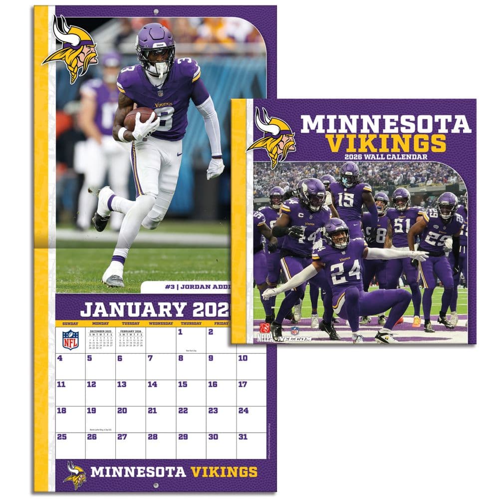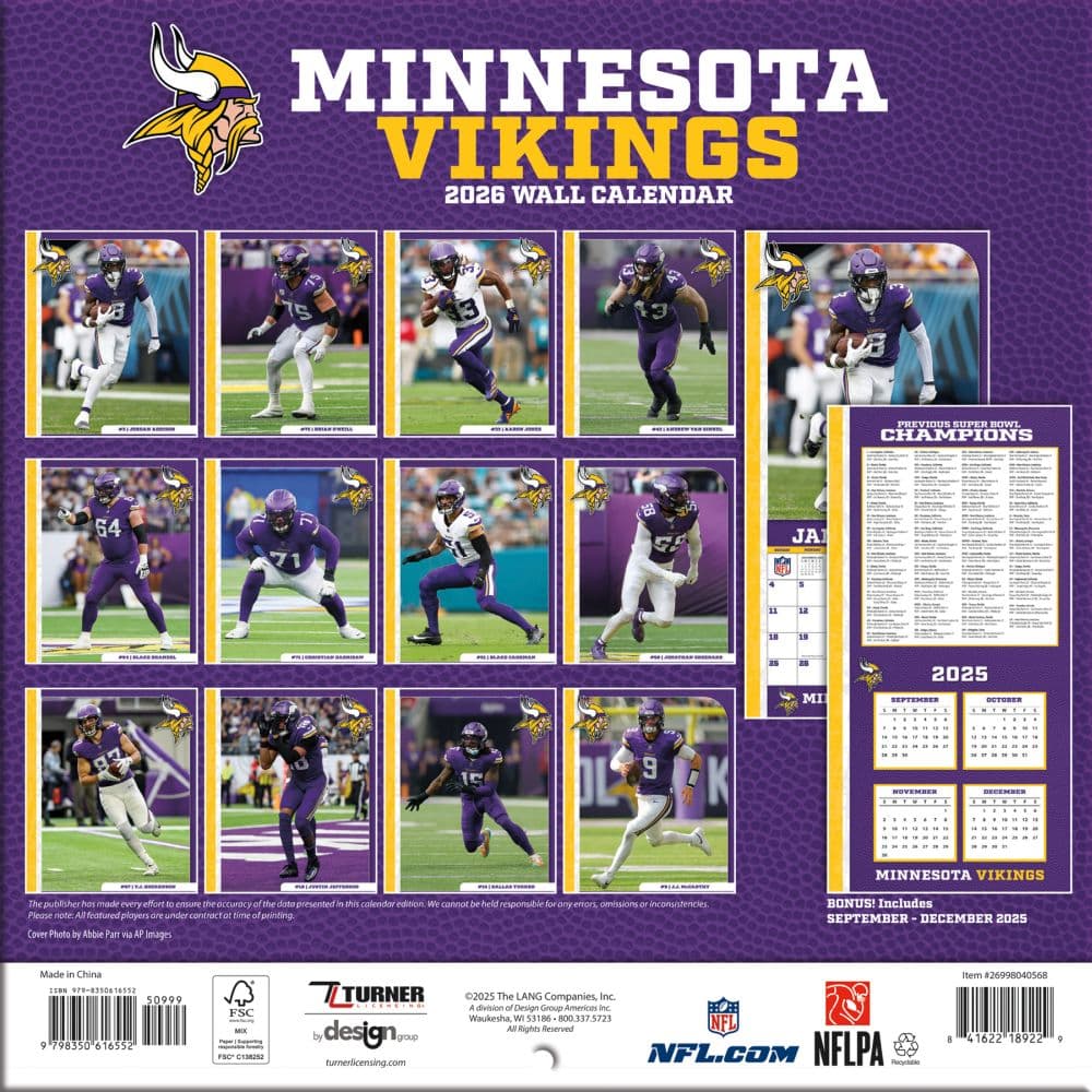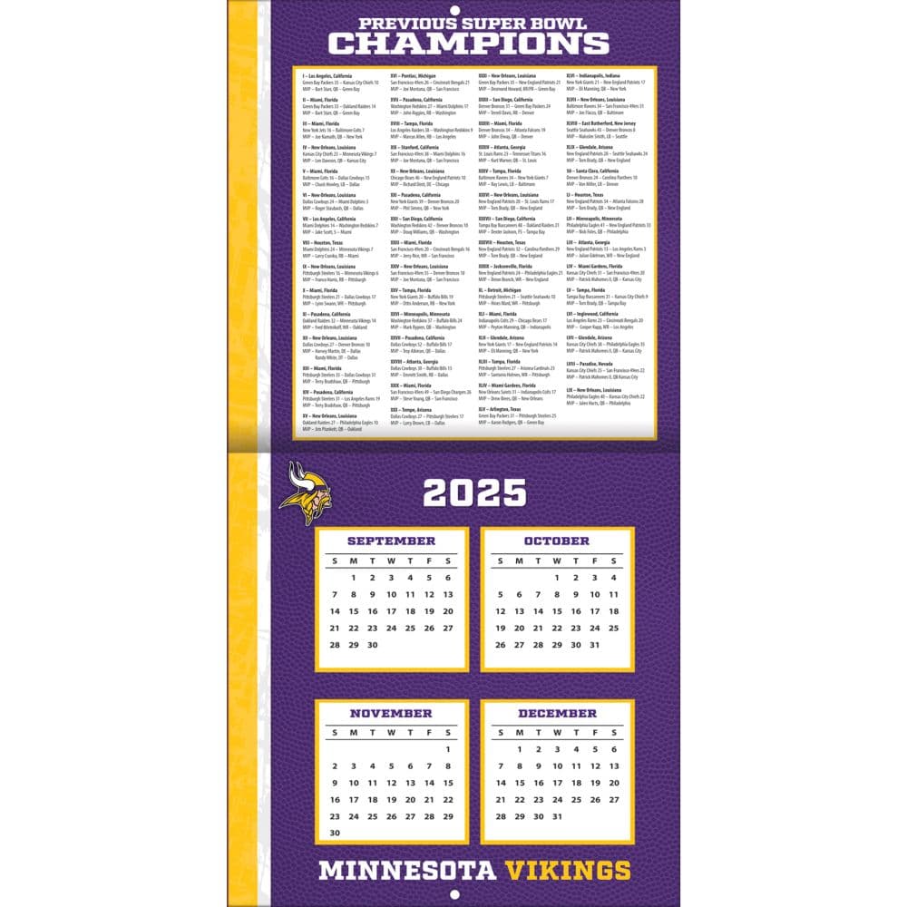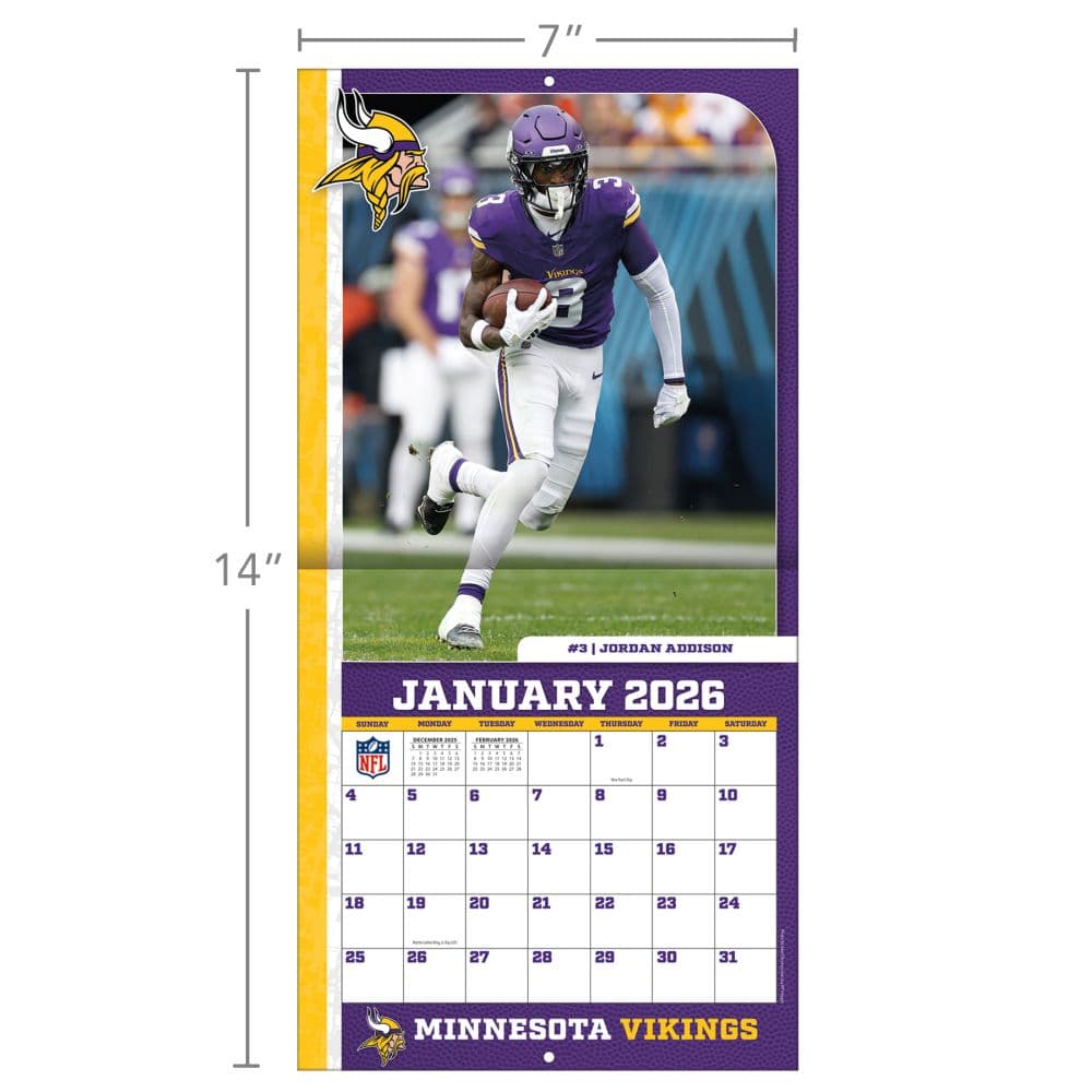 Made for passionate football fans, this mini wall calendar includes action shots of your favorite players from the Minnesota Vikings every month! Each month also includes professional athlete bios and new graphics featuring team colors and logos. Made with exceptional quality, the mini calendar also includes bonus pages that feature Sept. - Dec. 2024 and the past Super Bowl results! 12-month format (January - December 2025).