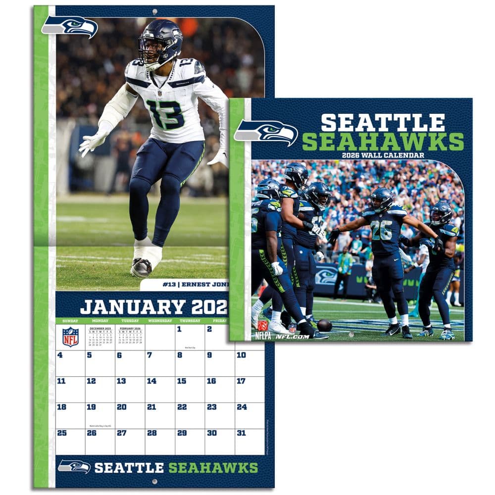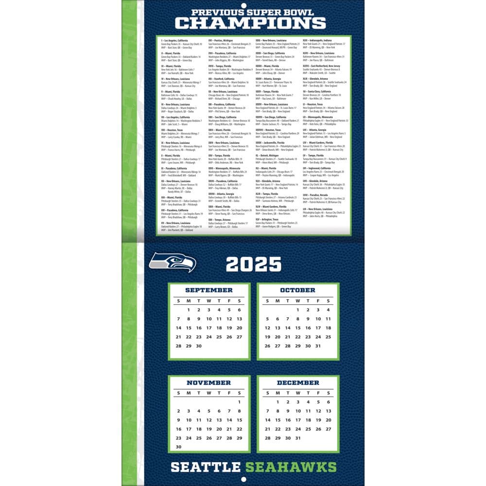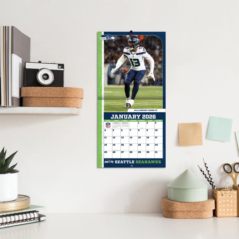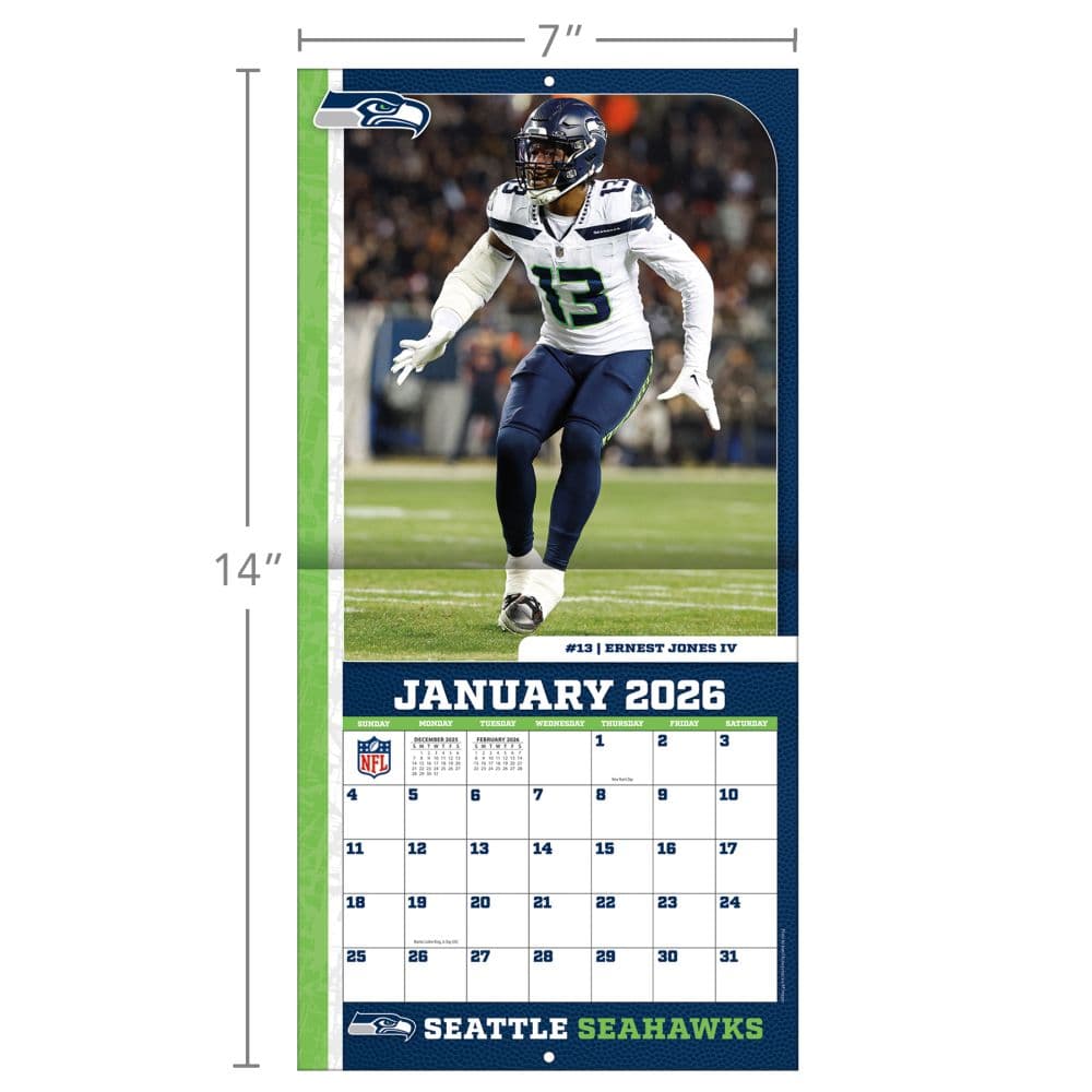 Made for passionate football fans, this mini wall calendar includes action shots of your favorite players from the Seattle Seahawks every month! Each month also includes professional athlete bios and new graphics featuring team colors and logos. Made with exceptional quality, the mini calendar also includes bonus pages that feature Sept. - Dec. 2024 and the past Super Bowl results! 12-month format (January - December 2025).