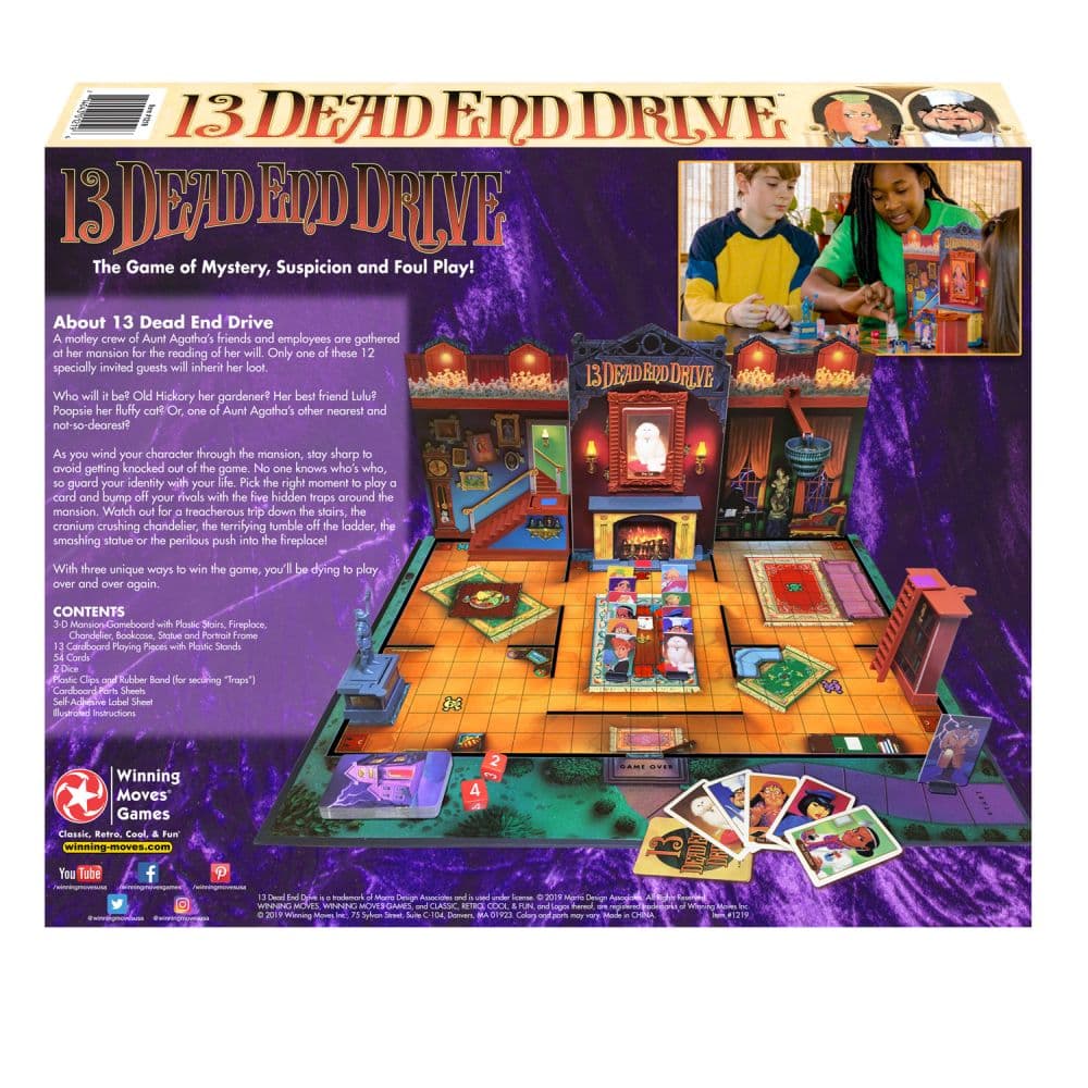 13 Dead End Drive is a murder themed board game from Milton Bradley. Released in 1993, it was followed in 2002 by a sequel, 1313 Dead End Drive. The story behind the game involves the death of a wealthy old woman triggering a feud over her will. The players utilize traps located on the game board, which represents a mansion, to kill characters controlled by other players in order to claim the estate for themselves