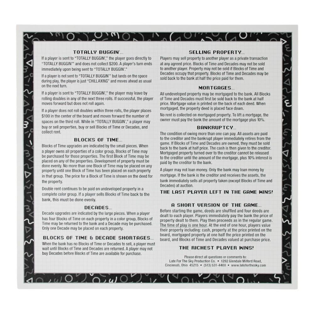 - Includes a game board, cards, tokens, and money pack, all themed around the 90s culture.