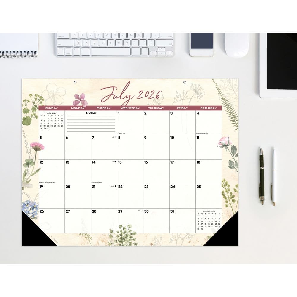 For students whose study aesthetic leans toward the botanical-illustration tradition and for professionals whose home office already includes prints or pressed-plant work across the academic year ahead. The botanical imagery runs consistently across each monthly page. The format gives a broad working surface for daily appointment marking. The botanical imagery pairs well with a broader plant-decorated home-office or study setup throughout the academic year ahead.