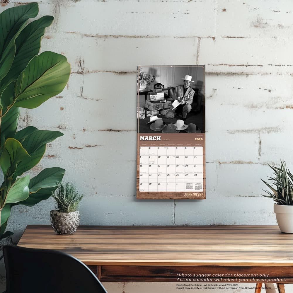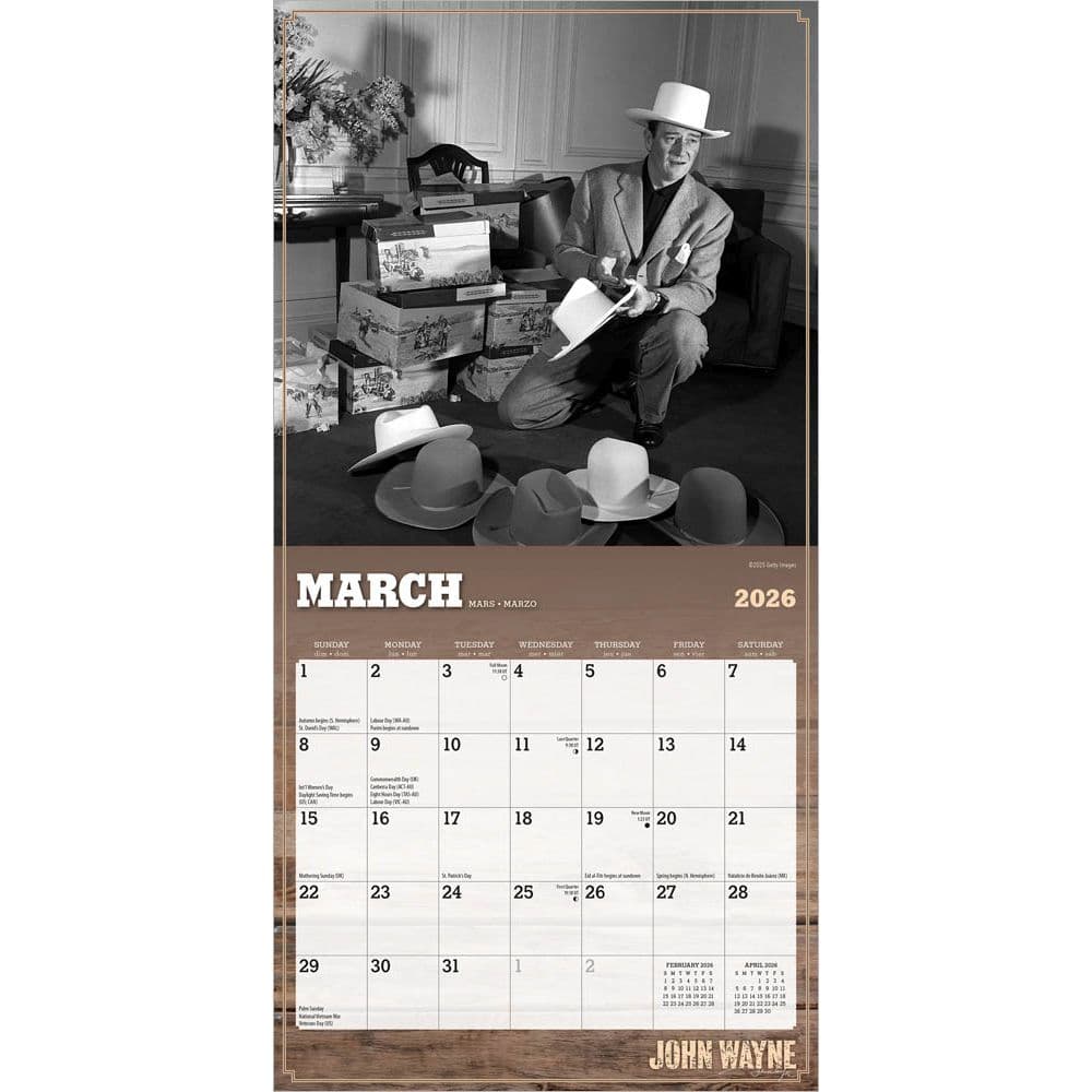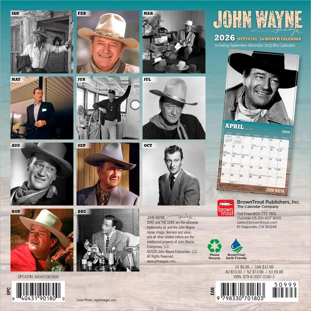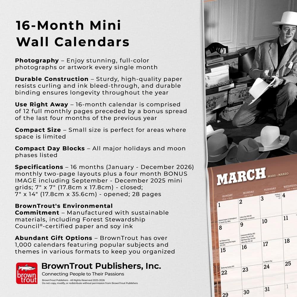 One of the world's most beloved and admired actors, John Wayne to this day represents the epitome of rugged individualism and masculinity on the silver screen. Equally at home in Westerns as well as playing war heroes, John Wayne enjoyed many diverse character roles throughout his long and varied film career. Celebrate the extraordinary life and career of John Wayne with this striking mini wall calendar.