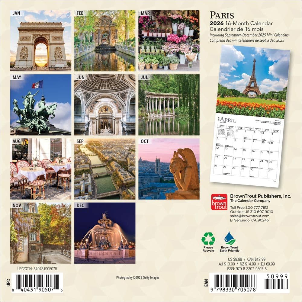 Masterpieces at the Louvre, the romance of the Eiffel Tower, legendary Notre Dame, the River Seine, caf?s crowded with talkative people, and of course, exquisite cuisine?Paris is a world unto itself. The City of Light is a treasure to behold. Visit spectacular Paris whenever you like with this dual-language calendar featuring month names, day names, and holidays in English and French.