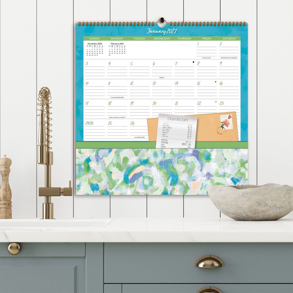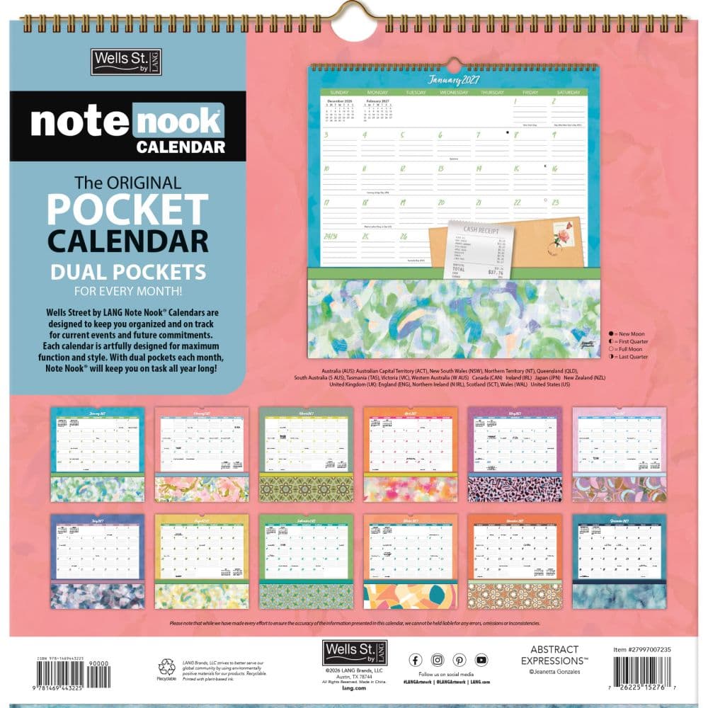 Organize your year with style and convenience using the 2027 Abstract Expressions Note Nook Wall Calendar by Wells Street by LANG. This unique not only provides a spacious monthly grid for appointments and events but also features dual pockets for each month, perfect for storing bills, receipts, and other important documents. Each pocket showcases vibrant, abstract artwork by Jeanetta Gonzales, adding a splash of color and inspiration to your daily planning.