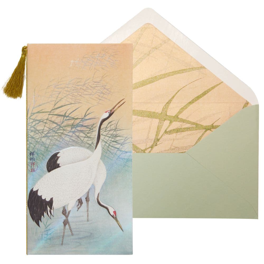 For a beautiful anniversary sentiment, our stunning Asian Two Cranes Anniversary Card is the perfect way to express your love and appreciation! This thoughtful greeting card features a Japanese style illustration of two cranes standing side by side beside an idyllic pond with some lush foliage in the background. The piece is embellished with luxurious metallic paper and a dainty tassel for added detail. With its subtle colors, graceful imagery, and heartfelt sentiment of "wishing you a beautiful anniversary", this card is sure to make your beloved feel cherished on their special day. Send this beautiful anniversary card today to say "Happy Anniversary" in style!