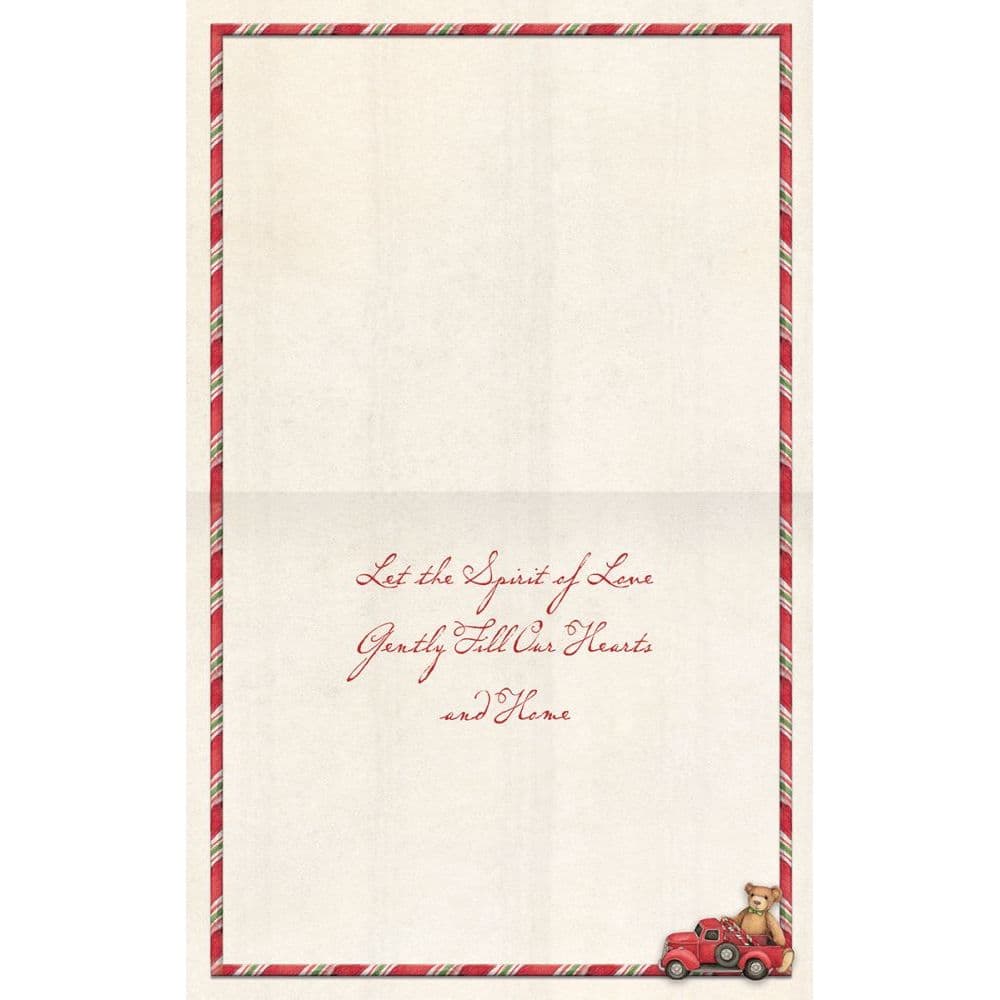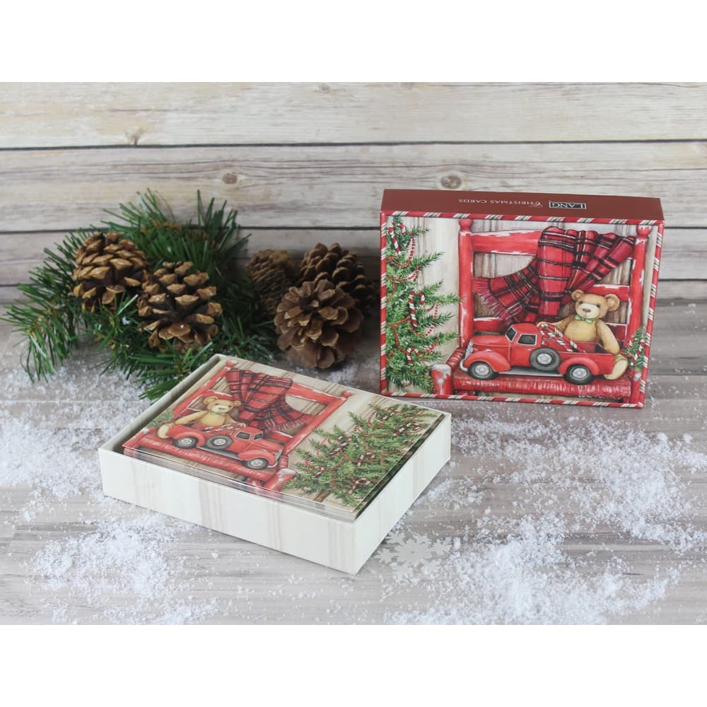Send season's greetings to your family and friends with the Bear In Chair Boxed Christmas Cards! This adorable teddy bear, red toy truck and Christmas tree adorned with candy canes by Susan Winget will fill hearts with holiday cheer. Boxed Christmas Cards combine colorful artwork with holiday greetings inside and out. With LANG quality features like linen embossed paper stock and glitter embellishment, these are a truly special way to connect with loved ones around the holidays!