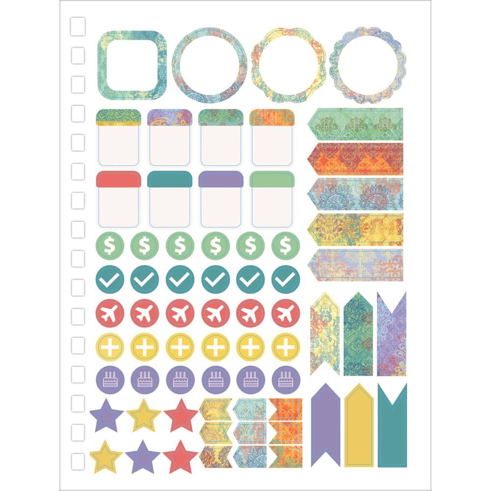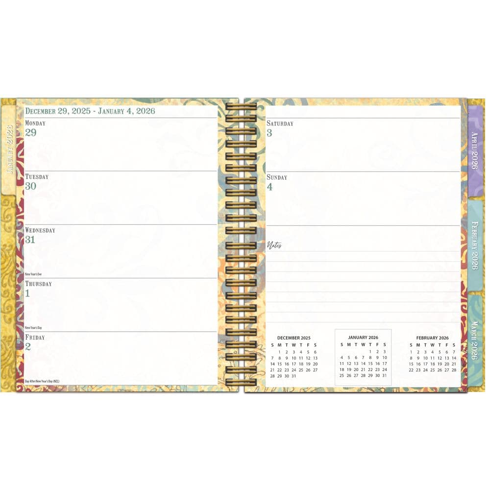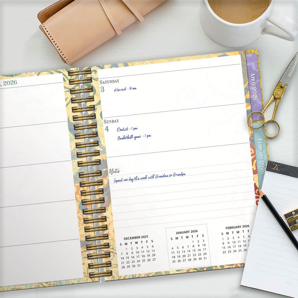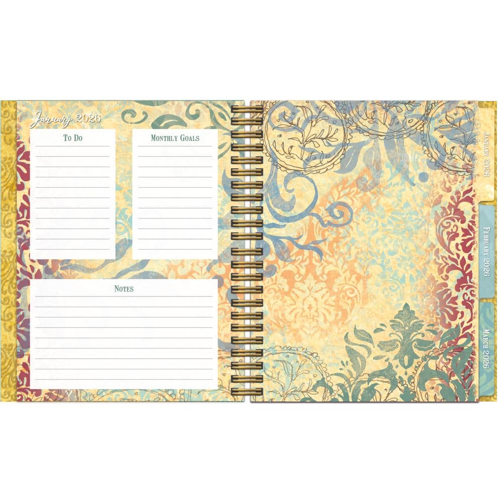 The WSBL Bohemian 2026 File-it? Planner is a planner and filing system all in one! Record your engagements on the calendar grid and store your documents in the built-in file folder for each month! Each file folder is perforated for easy removal and filing. A "Notes" section on the back lets you label the contents. In addition, the entire planner is decorated with colorful bohemian elements by artist Susan Winget!