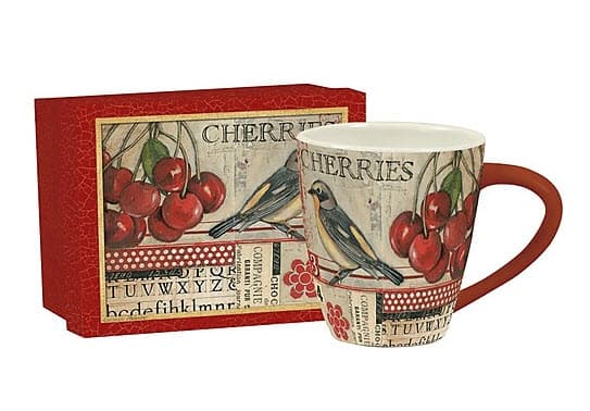 Pair your favorite morning cup of coffee with the inviting look of juicy, red cherries on the Carries Cafe Mug! The vibrancy of Kimberly Poloson's artwork will light up your morning with each sip of steaming coffee. The coordinating box is great for displaying the art or give it as a gift to a fellow coffee lover! Ceramic; 17 oz. capacity. Microwave and dishwasher safe. 4 color art inside and out. Includes coordinating gift box.