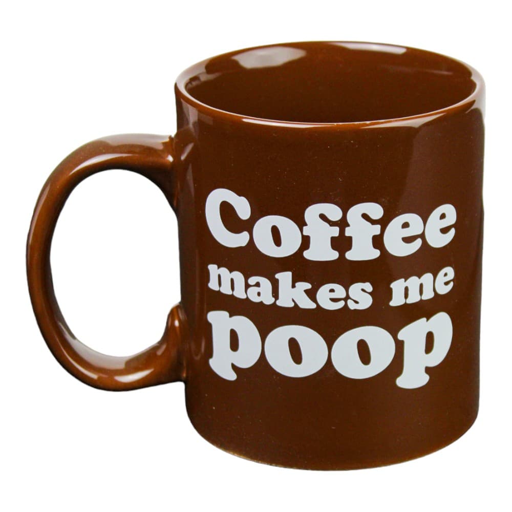 - Features a bold, eye-catching text that reads Coffee makes me poop