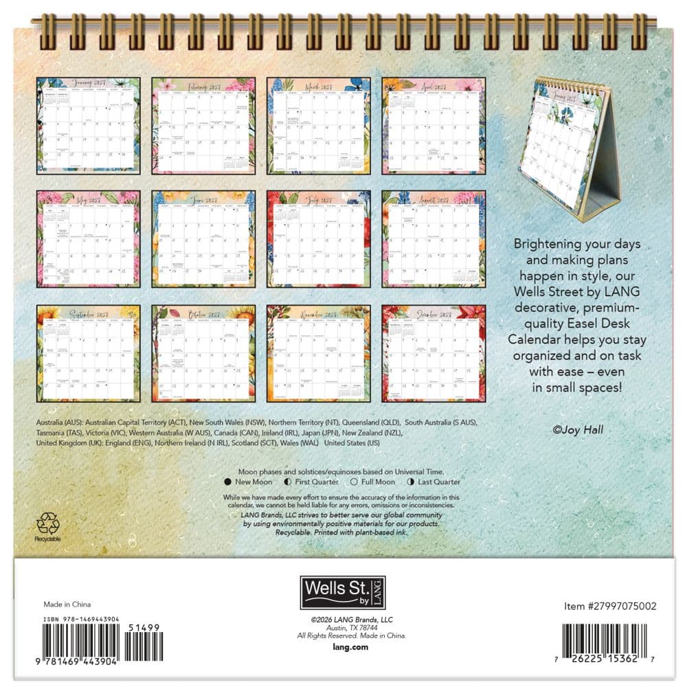 Pump up your desk game with the Wells Street by LANG Country Pleasures 2027 Easel Desk Calendar! Featuring mesmerizing artwork of stunning butterflies by Joy Hall, this calendar will add a pop of color and style to your workspace. Stay on top of your schedule in style with the 12-month format (January |December 2027). The built-in easel ensures easy viewing and showcases the full-color designs beautifully.
