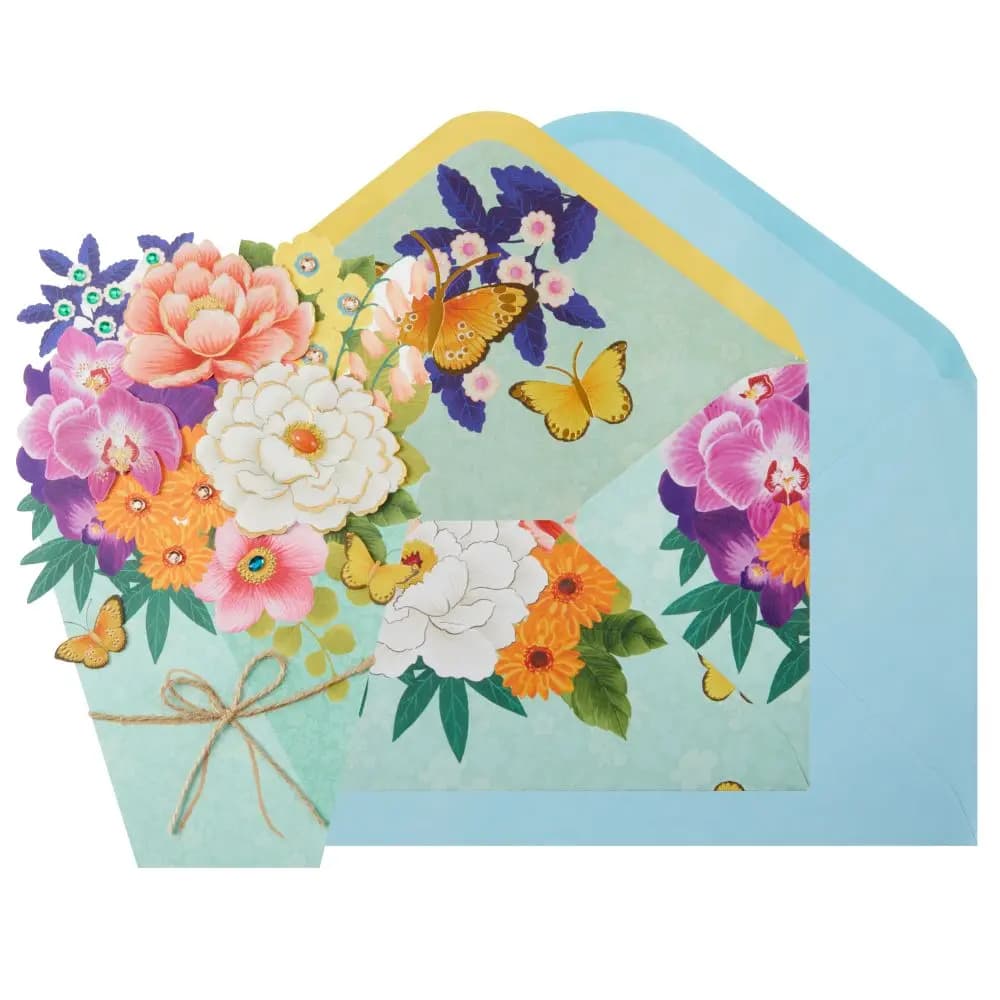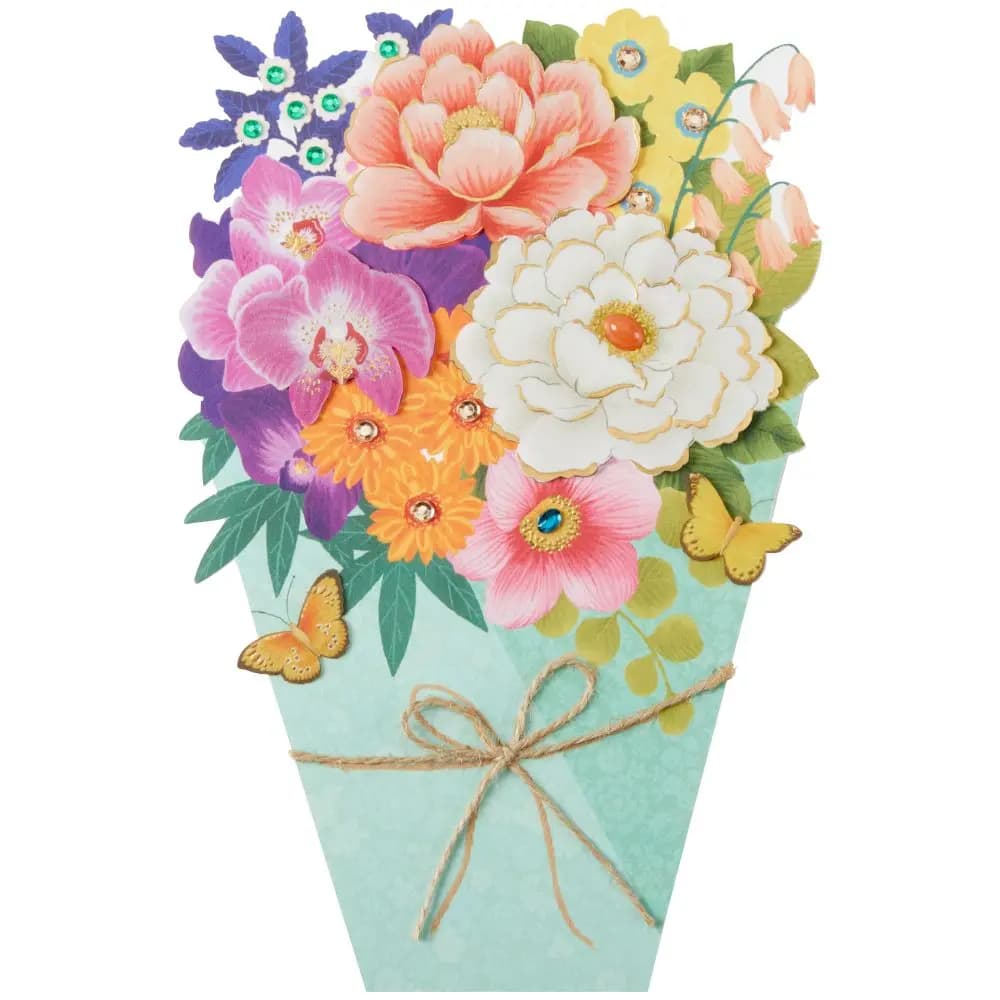 Innovative Craftsmanship: At the heart of this card is the intricate die-cut bouquet, bursting with vibrant colors and detailed craftsmanship. Each flower and leaf in the bouquet is delicately rendered, offering a visual delight to the beholder.
