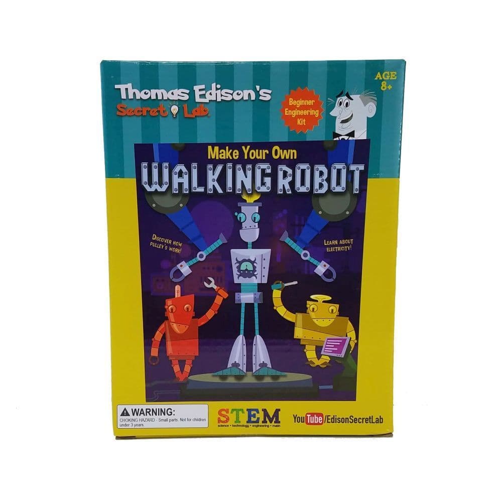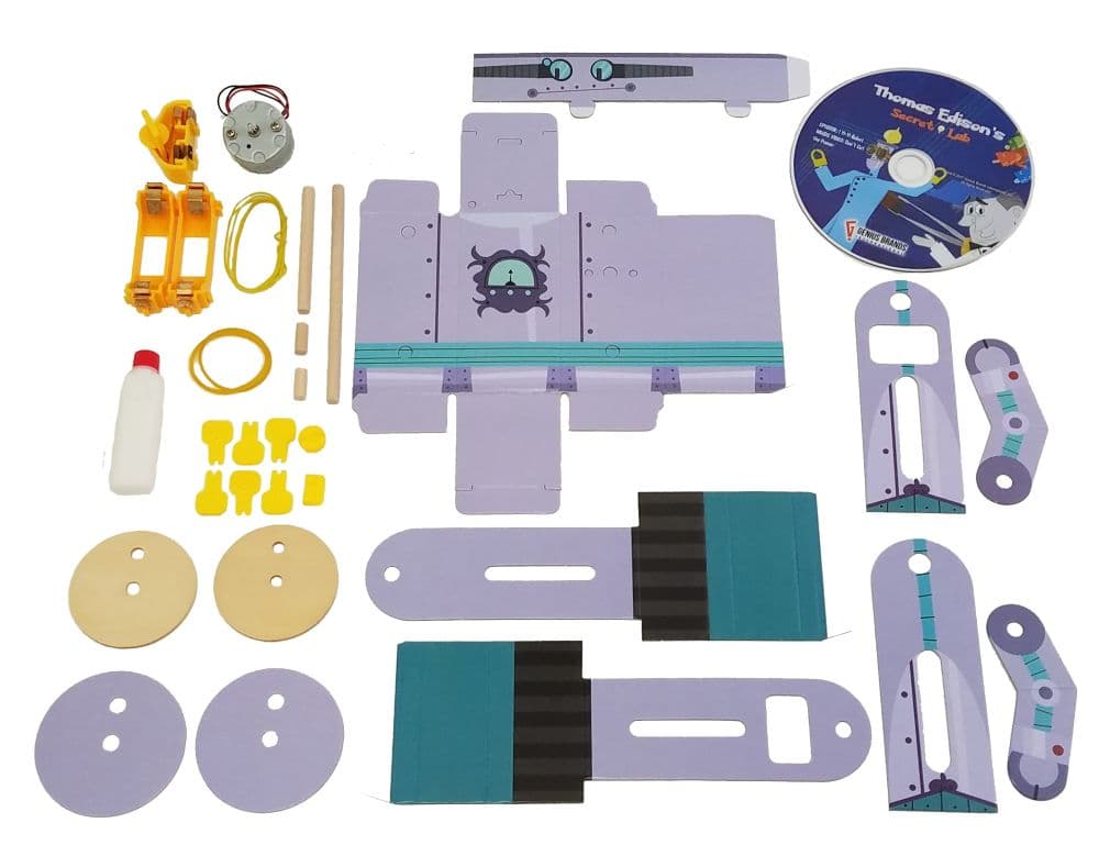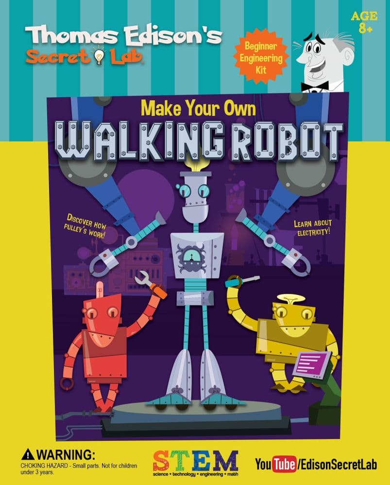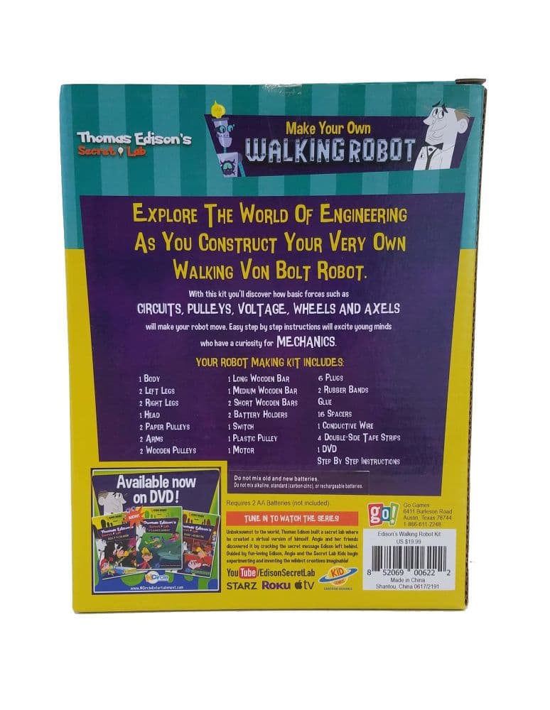 This activity kit allows kids to explore the world of engineering by constructing their very own Walking Von Bolt Robot. With this kit they?ll construct a ?simple machine? static pulley system and discover how basic forces such as circuits, pulleys, voltage, wheels and axels make their robot move.