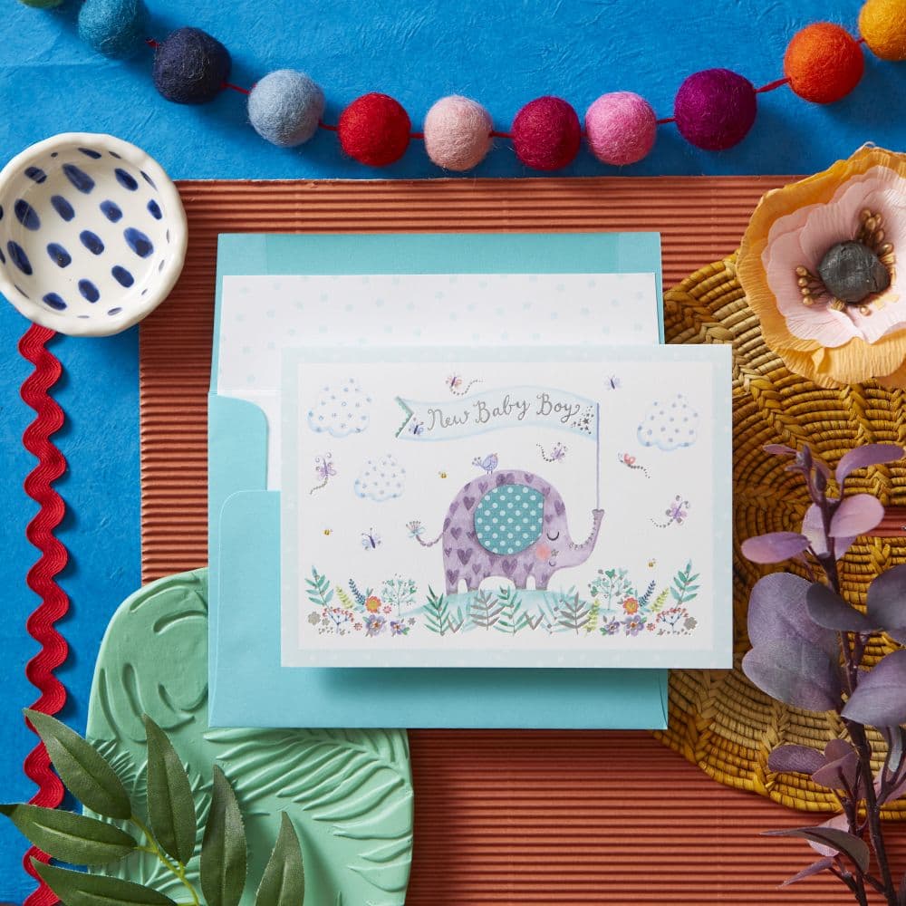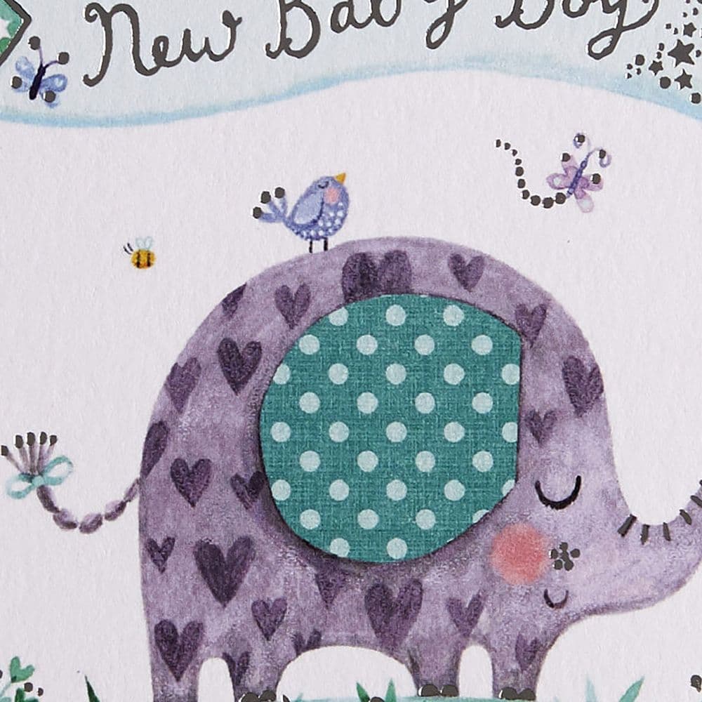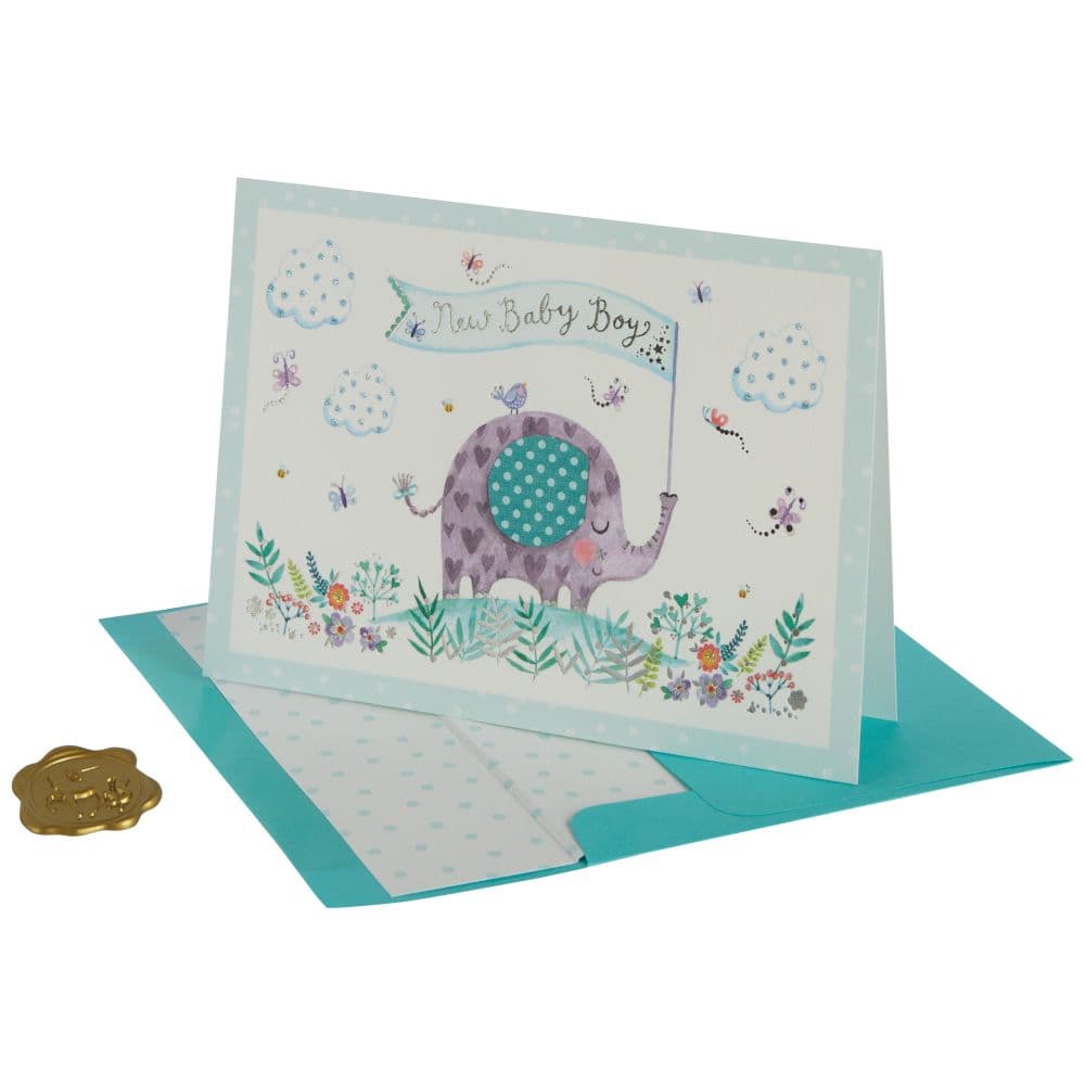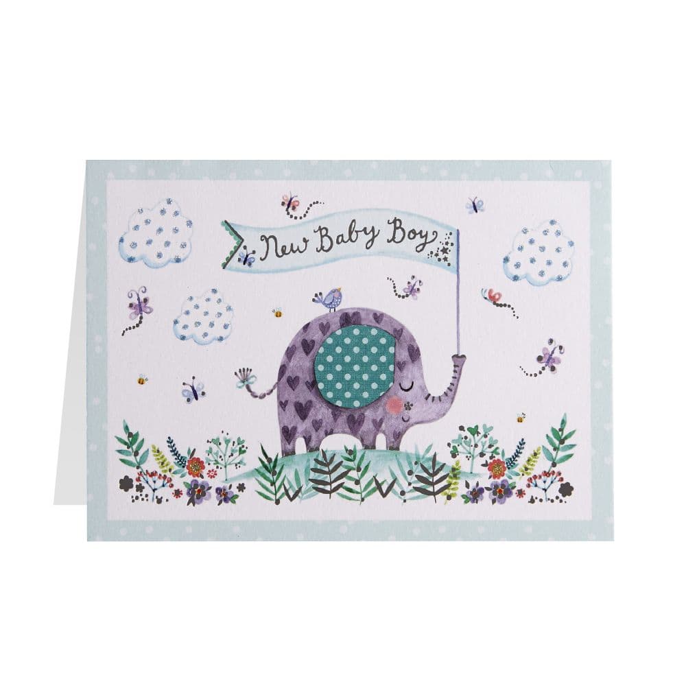 Welcome baby with a special greeting card showcasing the Elephant New Baby Card. This beautiful card from NIQUEA.D is sure to bring a smile to proud Parents and Grandparents alike.The illustrated insert features an adorable baby elephant wearing a blue bow, perfectly complimenting the blue motif on the outer of the card. Quality craftsmanship is on display with gold foil stamped accents and glitter adding that extra sparkle to ensure this momentous occasion is celebrated in style. Every card is finished with care and featuring the sentiment   Congratulations on the arrival of your beautiful Baby Boy ? it's a meaningful way for family and friends to share your joy for years to come!