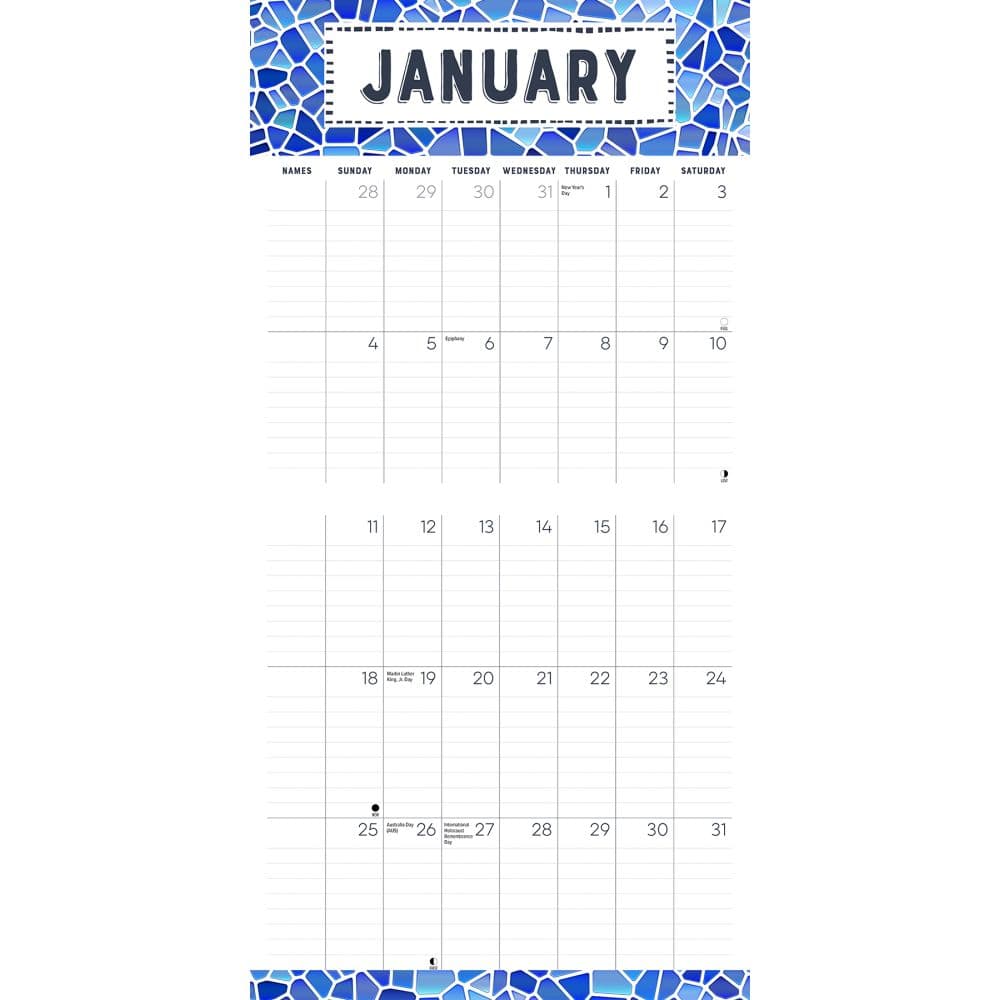 Each month showcases crisp, full-color images and a spacious grid design that makes tracking important dates and events a breeze. Whether it's for keeping track of family birthdays, anniversaries, or school events, this calendar is your ultimate companion for the year ahead. The stapled binding ensures durability while maintaining a neat, lay-flat design.