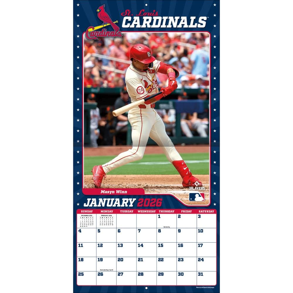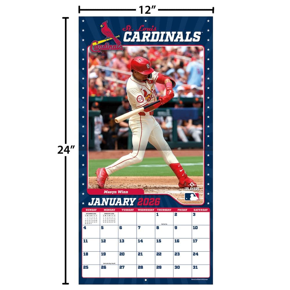 Made for passionate baseball fans, this team wall calendar includes poster-sized action shots of your favorite players from the St. Louis Cardinals every month! Each month also includes team & player facts featuring St. Louis Cardinals team colors and logos. Made with exceptional quality, the 12x12 calendar also includes bonus pages that feature Sept. - Dec. 2025 and the past World Series results! 12-month format (January - December 2026) Dimensions: 12"w x 24"h (opened)