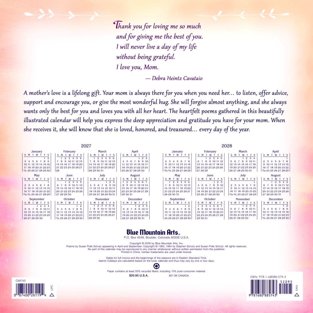 It can be difficult to put into words all the warm feelings a mother inspires. She's a best friend, a nurturer, and a remarkable woman who will forever hold a special place in your heart. With the loving words in this beautifully hand-illustrated 2027 calendar, you can remind her just how much she is appreciated, needed, and loved? every day of the year. This 12 x 12 inch hanging wall calendar is printed on high-quality textured paper, spiral bound, and fully illustrated, and it has ample space for recording important dates, appointments, and reminders. It's a perfect Christmas, birthday, thinking of you, or just because gift that will remind your mom all year through of all she means to you.