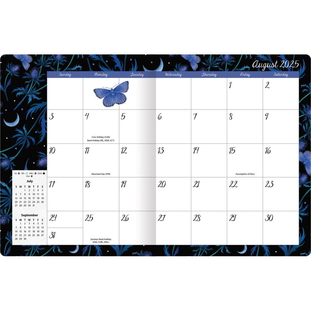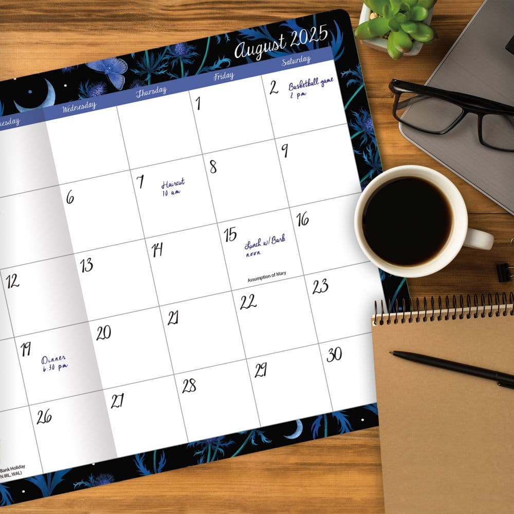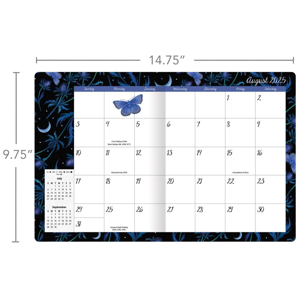 • Each monthly spread features large grid spaces for easy scheduling and note-taking, with moon phases and international holidays included for comprehensive planning.