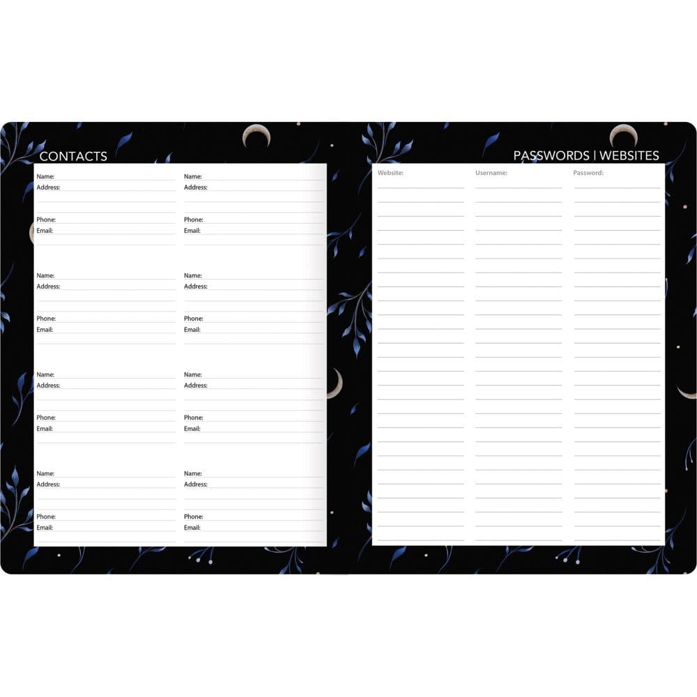 • Includes pages for contacts and passwords, ensuring that all your important information is neatly organized in one place.