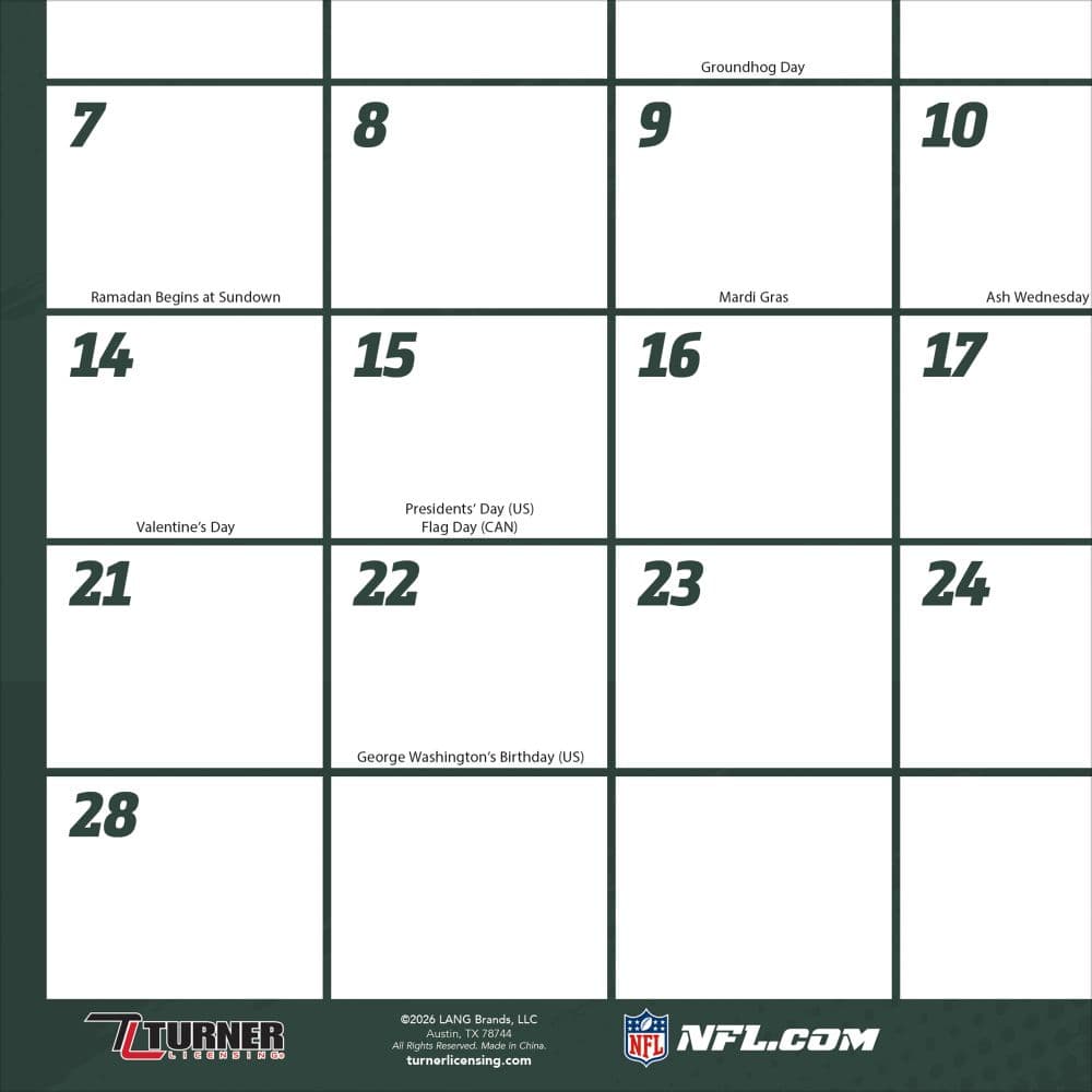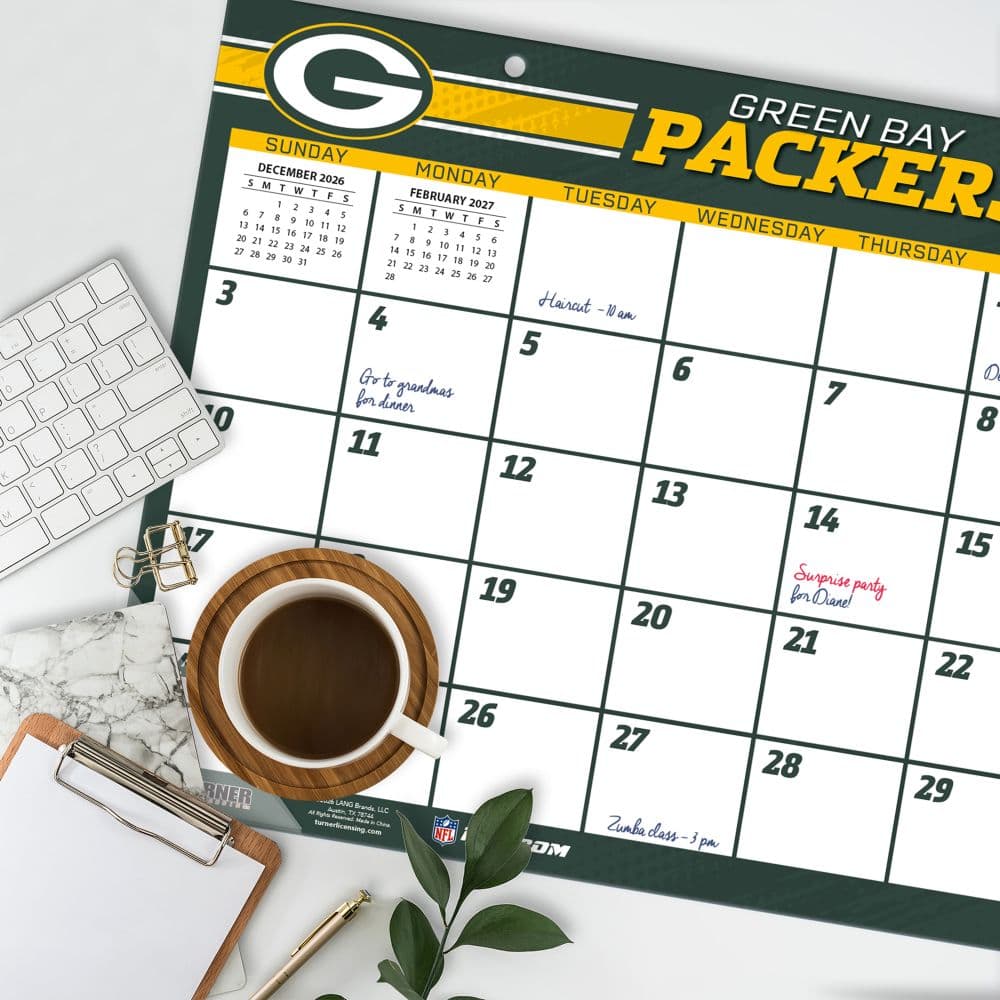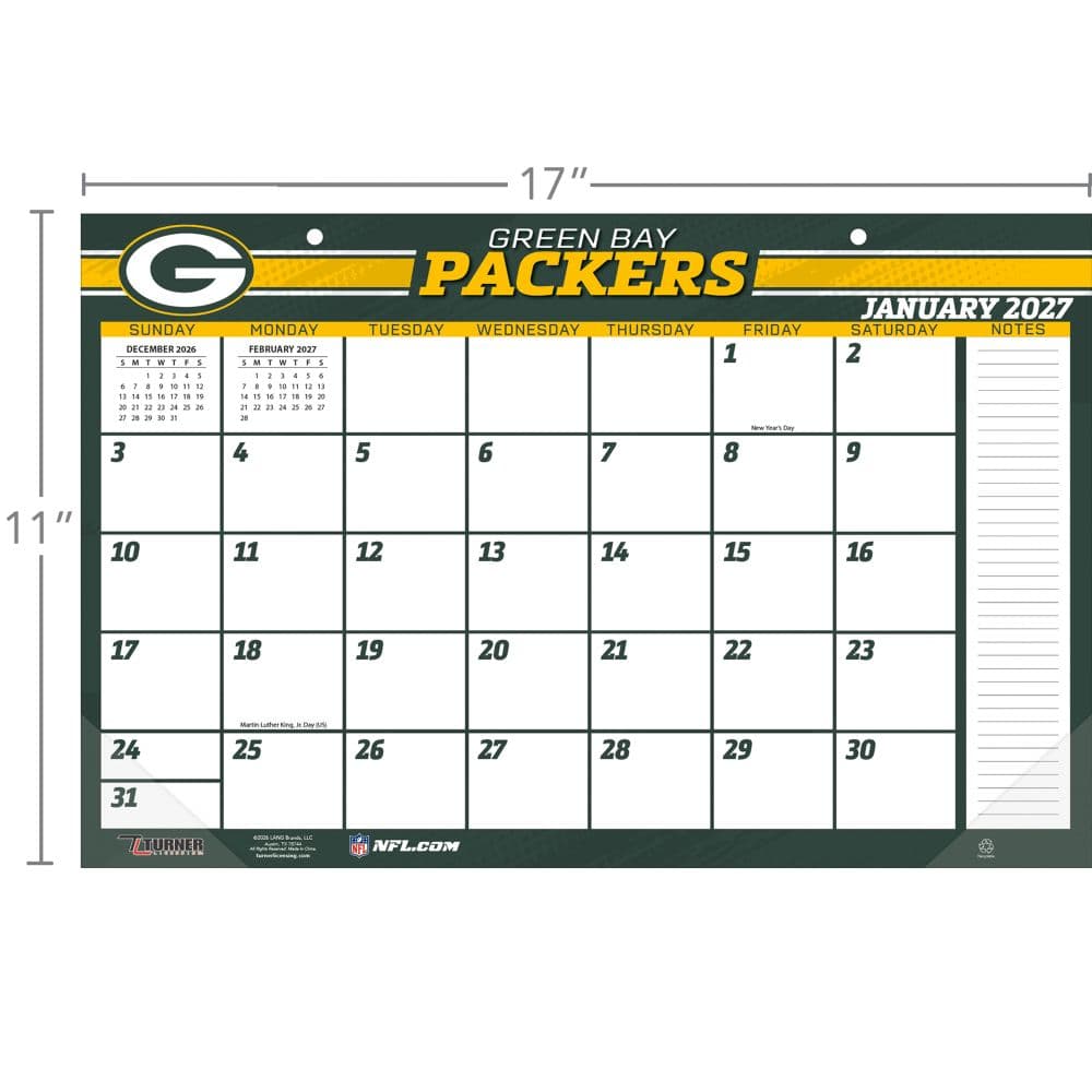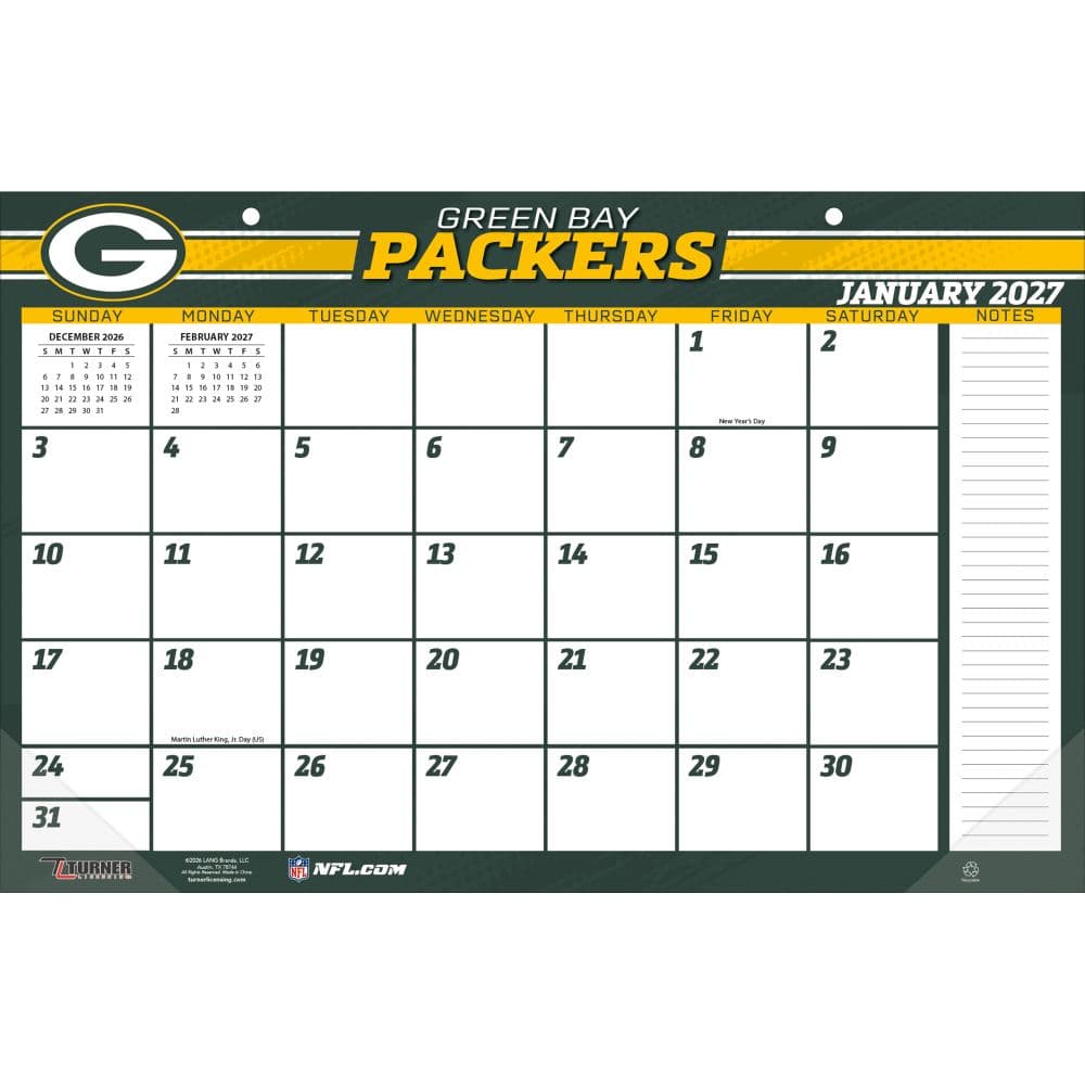 The Green Bay Packers are the NFL's only publicly owned franchise and hold thirteen league championships including four Super Bowl titles, with the Lambeau Field home environment and the specific Wisconsin cold-weather football culture producing a fan experience unlike any other in American professional sports. The NFL Green Bay Packers 2027 Desk Pad from Turner Licensing carries the team's green-and-gold identity across twelve tear-off monthly pages in the oversized desk pad format, with room for appointments and game-day notes alongside each month's grid. Each tear-off page carries Packers imagery across the month, from Lambeau Field game-day atmosphere to the broader franchise history through the year across the full NFL calendar.