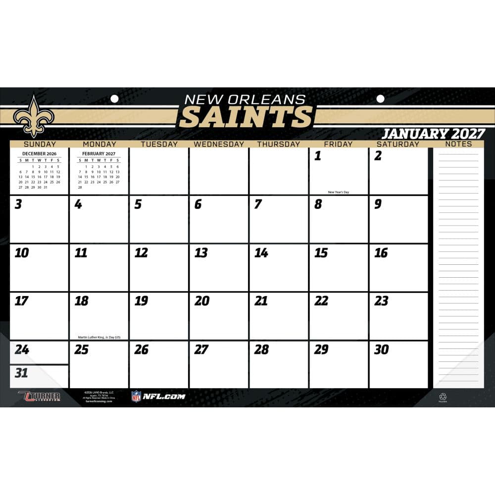 The New Orleans Saints won Super Bowl XLIV in February 2010, with Drew Brees and coach Sean Payton producing the title that the city had been waiting for since the franchise's 1967 founding and that carried symbolic weight in post-Katrina New Orleans. The NFL New Orleans Saints 2027 Desk Pad from Turner Licensing carries the team's black-and-gold identity across twelve tear-off monthly pages in the oversized desk pad format, with room for appointments and game-day notes alongside each month's grid. Expect franchise imagery connecting current roster work to the broader Who Dat tradition. Each tear-off page carries Saints imagery across the month, keeping team identity on the desk through the long NFL season across every working day of the year.
