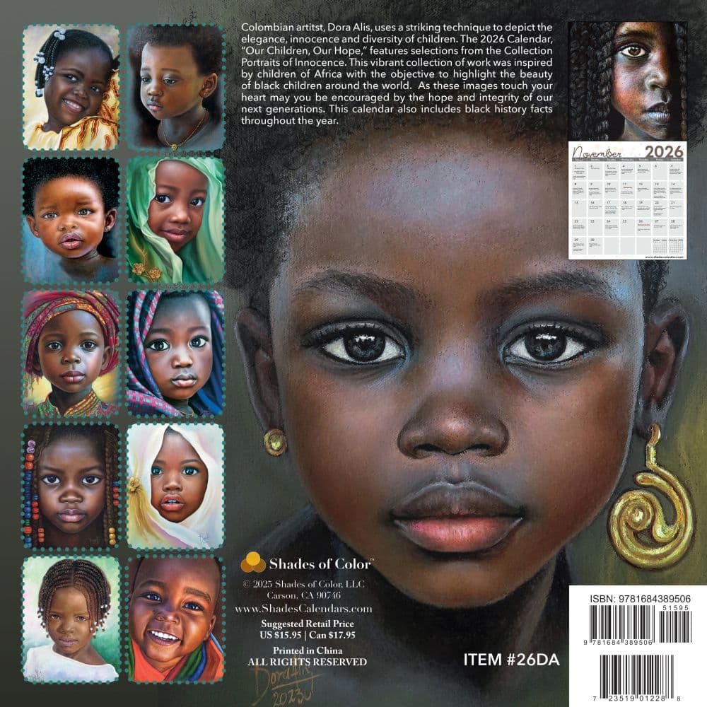 Celebrate the elegance, innocence, and diversity of children with the Our Children Our Hope 2026 Wall Calendar. Featuring the captivating artwork of Columbian artist Dora Alis, this calendar draws inspiration from the children of Africa to highlight the beauty of black children worldwide. Each month unveils a new portrait that embodies hope and integrity, aiming to inspire as you organize your year.