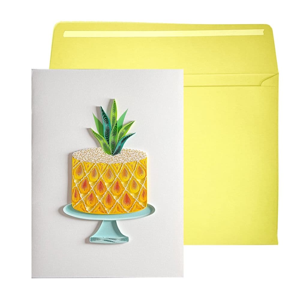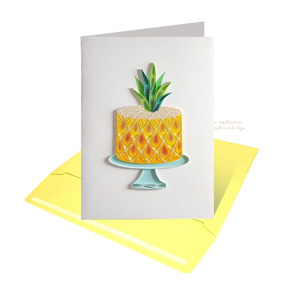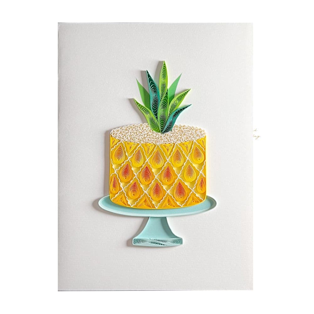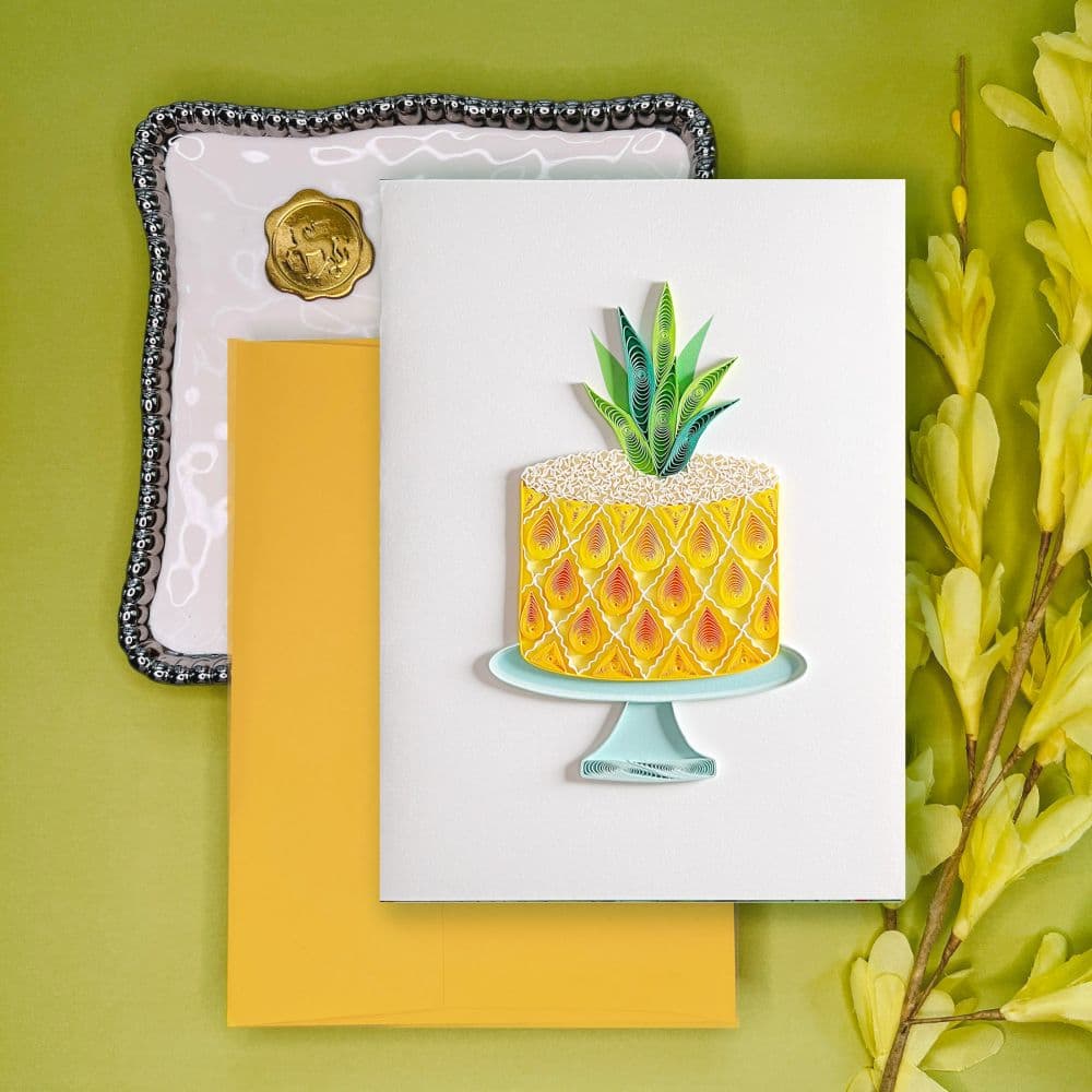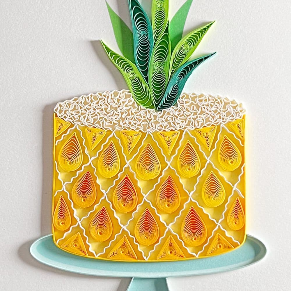 • Intricate Quilling Design: Handcrafted with meticulous detail, the card features a stunning quilled pineapple cake. Each coil and fold of paper is expertly arranged to create a vibrant, three-dimensional masterpiece that showcases the artistry of quilling.