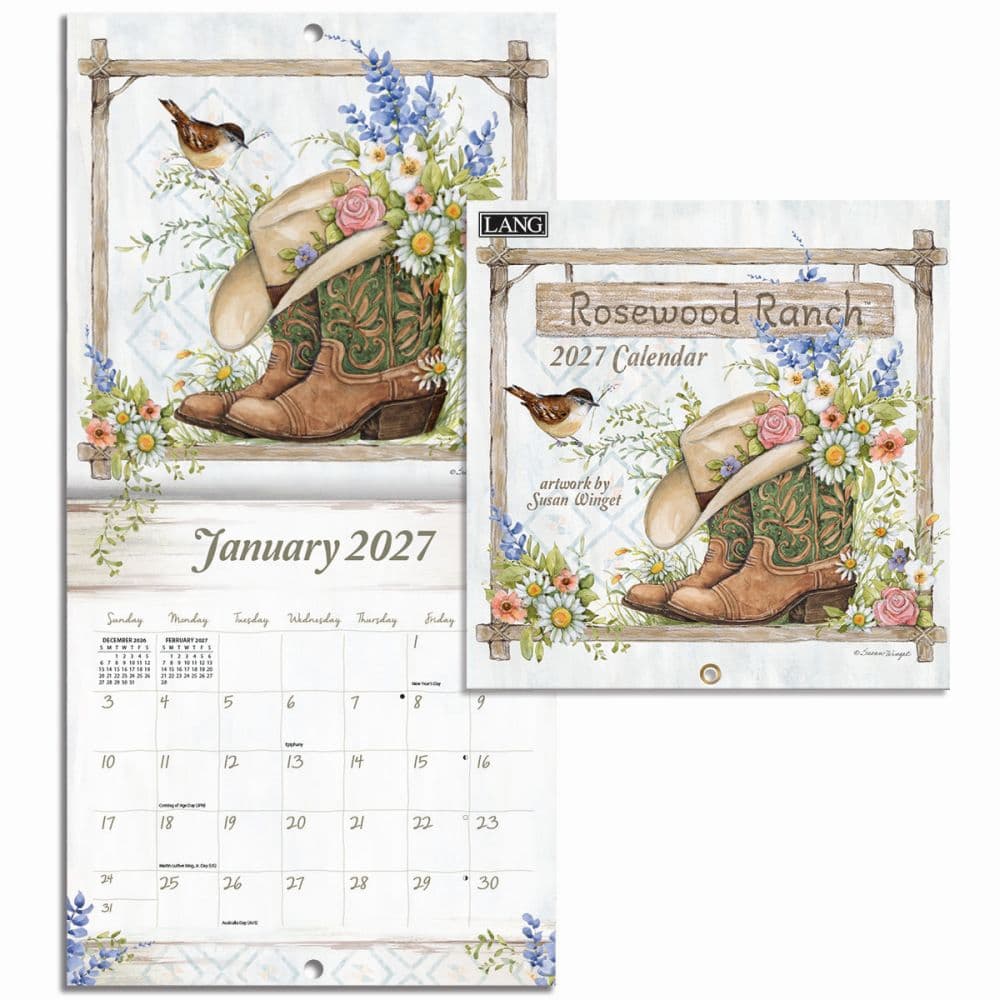 The Rosewood Ranch 2027 Mini Wall Calendar features Susan Winget's beautiful western scenes decorating each month of the year. LANG Mini Wall Calendars are made with elegant linen embossed paper stock in a space-efficient format.