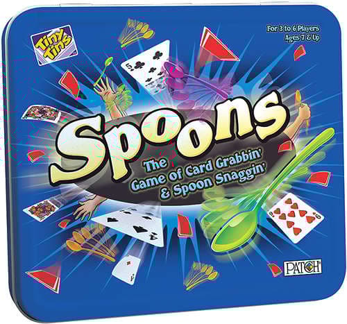 Spoons Card Game: Spoons is the family card game that's larger than life. Pass cards until someone gets 4 of a kind then race to grab a spoon. Players are eliminated one by one, until the last person holding a spoon wins. Includes one standard deck of cards and five oversized plastic spoons. For 3 to 8 players. Ages 7 years and up.