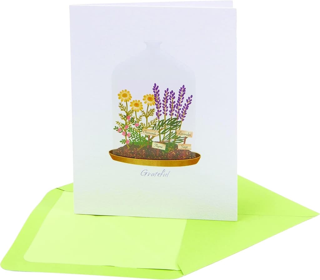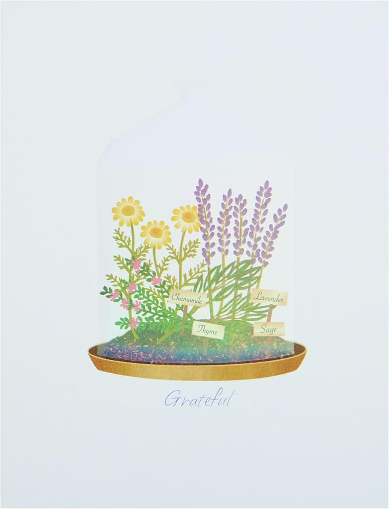 Elegant design featuring plants under glass cloches, paired with the heartfelt message of "Grateful"