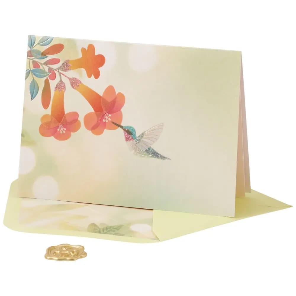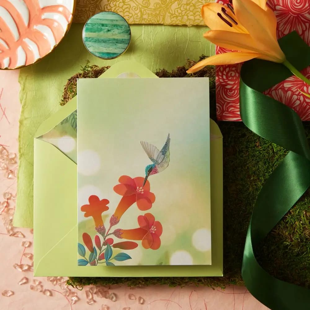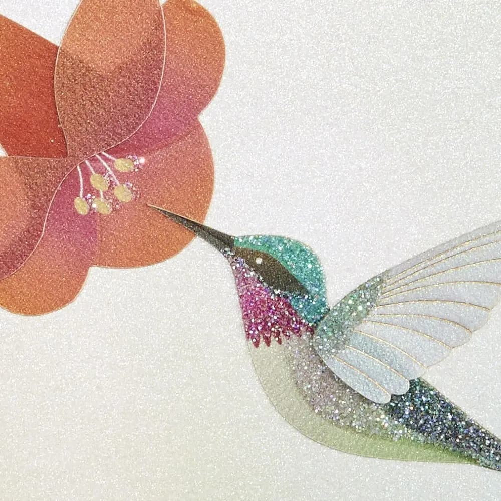 A perfect gesture for any occasion! Show someone you care with this exquisite Vellum Hummingbird Blank Card from NIQUEA.D. Expertly crafted, this handmade blank card features an intricate hummingbird and flowers motif in dazzling colors. To make it stand out even more, tip ons made from rich vellum paper and dazzling glitter were added for extra flair. When you?re ready to use it, simply flip the greeting card over to add your heartfelt personal message inside. No matter who you?re sending this greeting card to?whether they?re family, friends, or co workers?you can be sure that your thoughtful present will be appreciated. Express your feelings with the Vellum Hummingbird Blank Card by NIQUEA.D!
