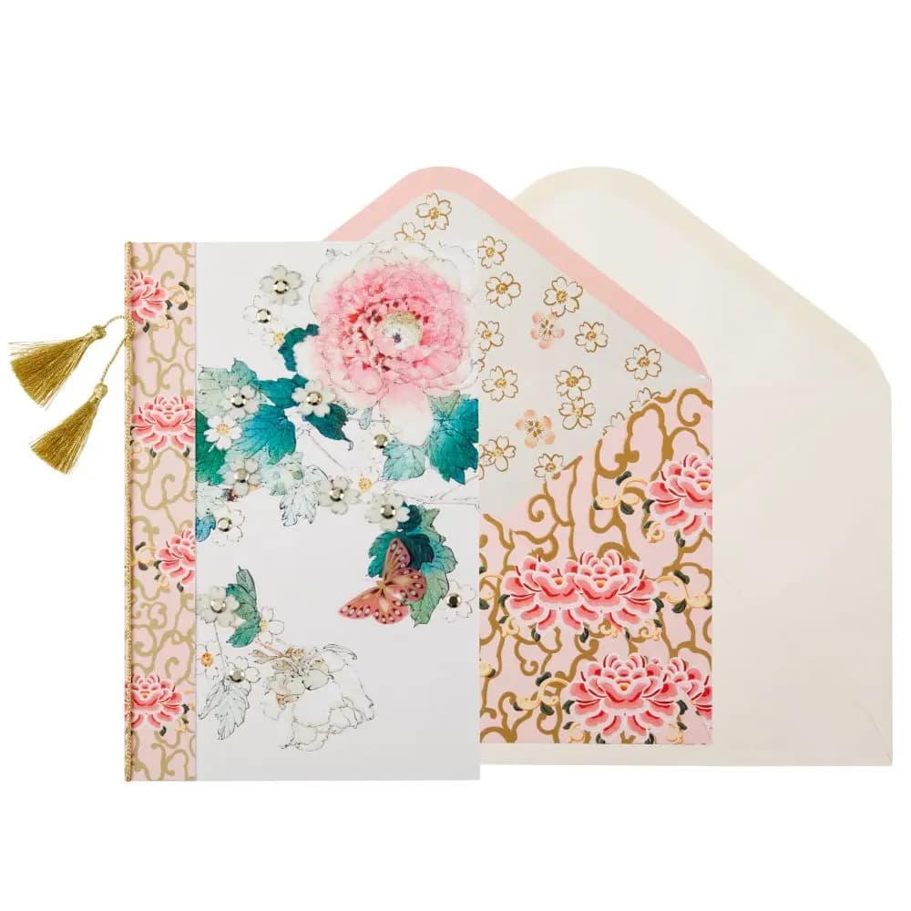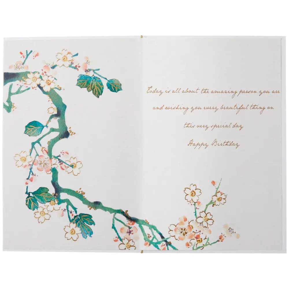 Artistic Interior: Open to a space where tradition meets sentiment. The interior continues the aesthetic journey with designs inspired by Japan's vintage art era, presenting a beautiful backdrop for your heartfelt birthday messages.