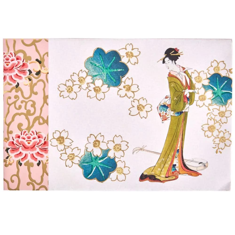 Timeless Allure: The card showcases the serene elegance of a vintage Japanese figure, harmoniously paired with traditional floral motifs. Every detail, from the gentle curve of the figure to the intricate blossoms, encapsulates the beauty and depth of Japanese art.