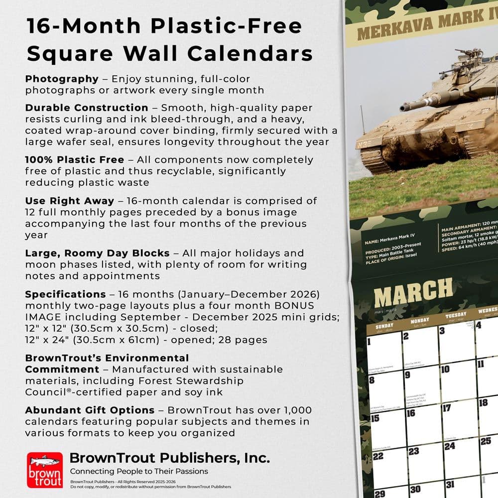 Celebrate the engineering prowess and historical significance of military tanks with the Tanks of the World 2026 Wall Calendar from BrownTrout Publishers. This 16-month calendar showcases iconic tanks from around the globe, each month featuring a different legendary tank along with detailed facts about its design, history, and role in military conflicts. Perfect for military enthusiasts and history buffs alike, this calendar is a tribute to the tanks that have shaped modern warfare.